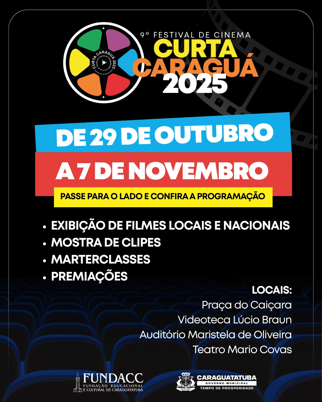 Desde quarta-feira (29/10/2025), a Curta Caraguá – 9ª edição do festival de cinema em Caraguatatuba – dará início a uma programação gratuita voltada à formação de público, ao fomento da produção local e à valorização de talentos da região.